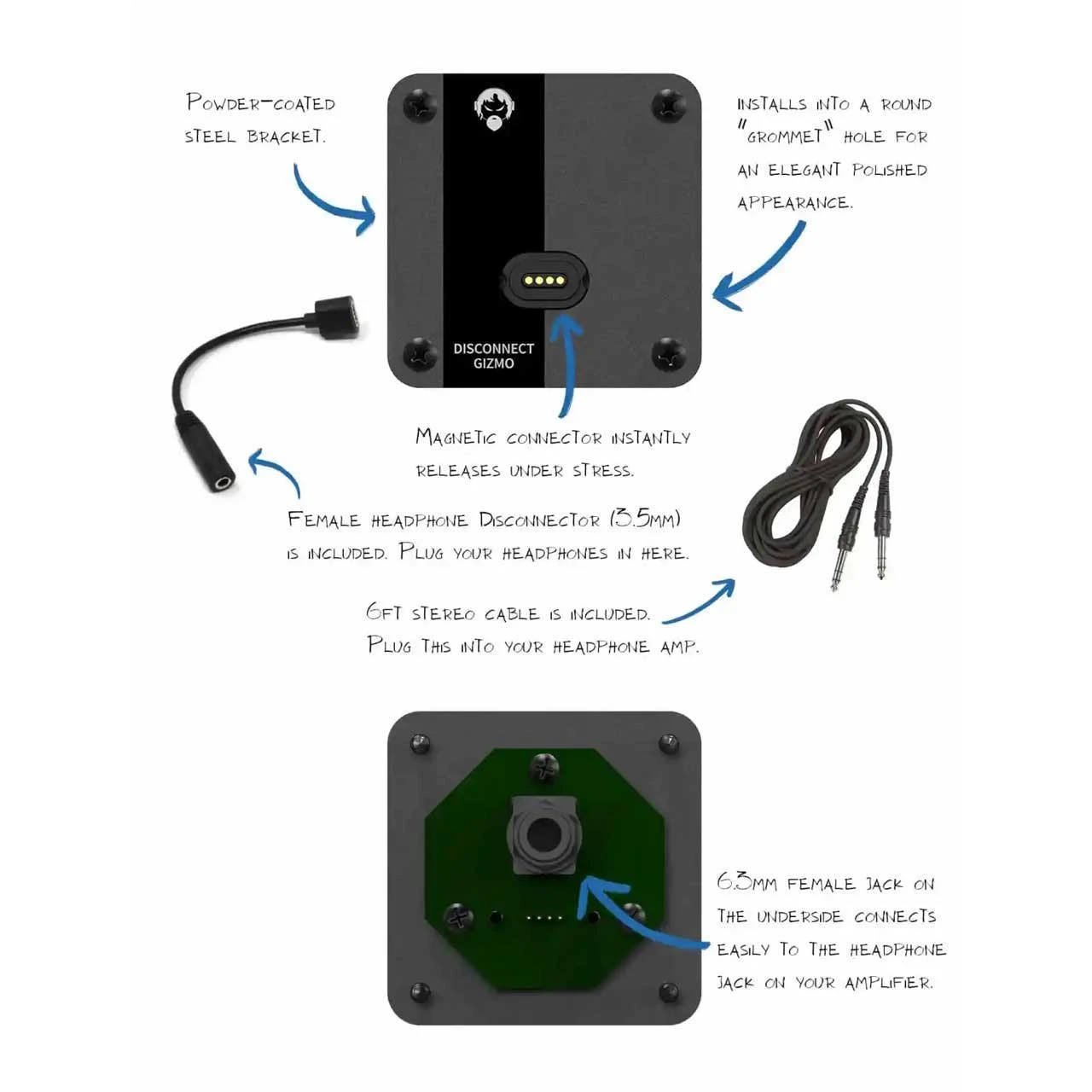 The Angry Audio Headphone Disconnector Gizmo mounts into your studio furniture for an elegant streamlined appearance. Installation is fast and easy with nothing more than a hole-saw and a screwdriver. The Disconnector Gizmo includes the mating connector for your headphones (3.5mm jack). It even includes a TRS unbalanced cable to go between your headphone jack and the rear of the Disconnector Gizmo.