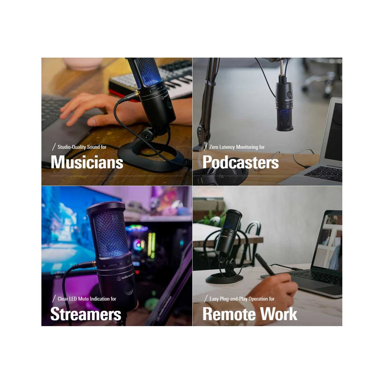 The microphone’s directional pickup (cardioid) keeps the focus on your voice or other chosen sound source, while its high-resolution A/D converter (up to 24-bit/96 kHz sampling rate) ensures extremely clear, natural sound reproduction. The AT2020USB-X features a built-in headphone jack with volume control to let you directly monitor the microphone signal with no delay. It also offers a mix control to let you blend the microphone’s audio with audio from the computer, and has a silent touch-sensitive mute button to quickly and easily mute audio at the microphone.