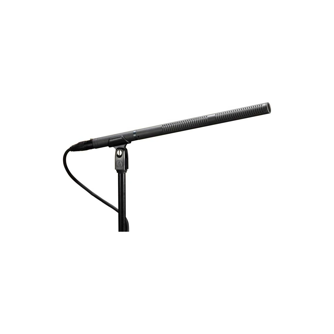 The Audio-Technica AT8035 is a fixed-charge condenser microphone with a line + gradient polar pattern. It is designed for video production, broadcast (ENG/EFP) audio acquisition, wildlife recording and high-quality sound reinforcement. The microphone’s highly directional polar pattern provides a narrow acceptance angle along with crisp, intelligible audio reproduction desirable for long-distance sound pickup and is suited for both boom & handheld use. The output of the microphone is a 3-pin XLRM-type connector. A switch permits choice of flat response or low-frequency roll-off (via integral 80Hz high-pass filter) to help control undesired ambient noise. The microphone is enclosed in a rugged housing. The microphone requires 11V to 52V phantom power or a 1.5V AA battery for operation. A battery need not be in place for phantom power operation.The included AT8405a stand clamp permits mounting on any microphone stand with 5/8″-27 threads. A windscreen, two o-rings, a battery and a protective carrying case are also included.