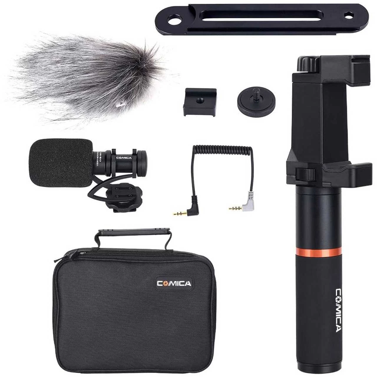 Comica CVM-VM10-K4 from Comica is a Cardioid directional microphone kit for Smartphones. The K4 version of the kit includes an accessory rod with a cold shoe mount which allows you to mount accessories such as an LED light. It is compatible with iPhones when using the Lightning interface adapter dongle from Apple.