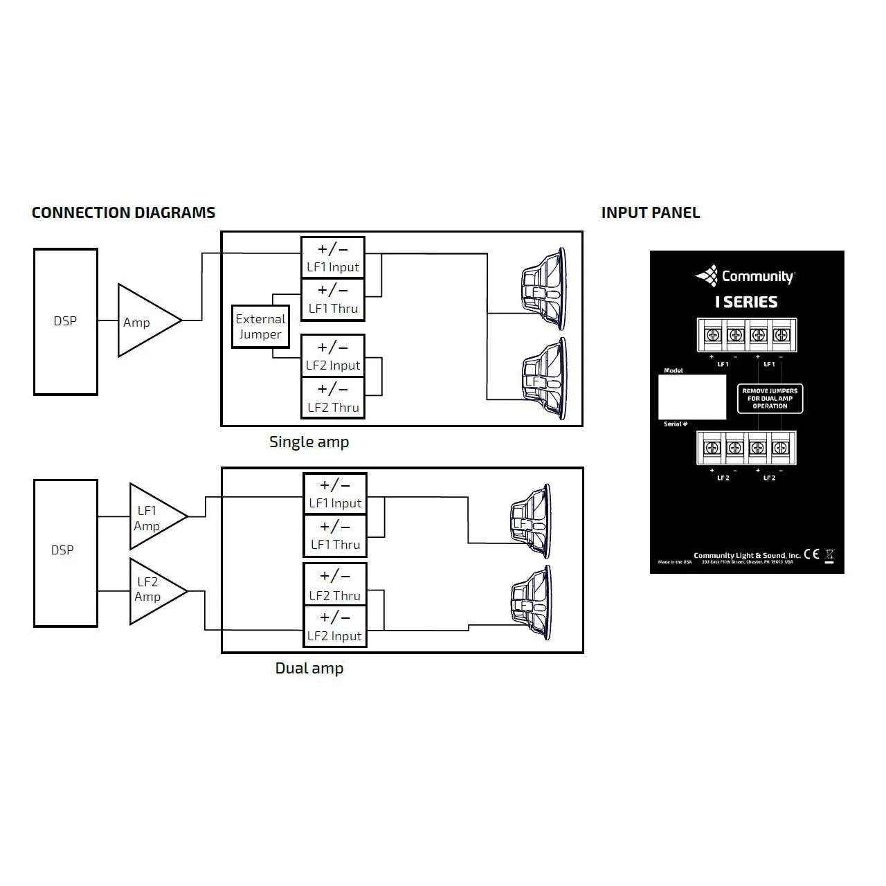 I SERIES similar-sized rectangular enclosures, construction, finish and aligned suspension points for seamless flown array integration. Medium power, 700W(+) continuous power handling, ferrite woofers. User selectable single amp or dual amp operation on the dual subwoofer models. Rubber feet included for floor installation. Easily configured low profile rigging hardware available for multiple applications (see Accessories).