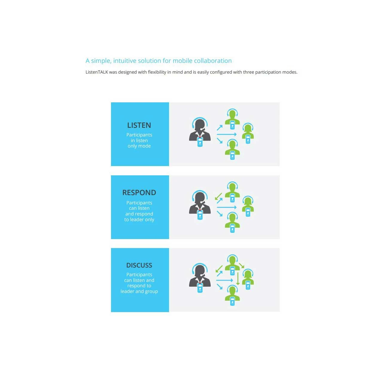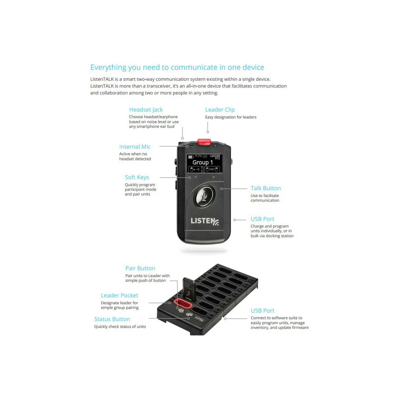 ListenTALK is simple: Groups can be configured with the push of a button in the docking station tray or on the go with Near Field Communication (NFC) technology. ListenTALK is flexible: Leaders can easily designate one of three participant modes to meet the needs of any venue or setting.