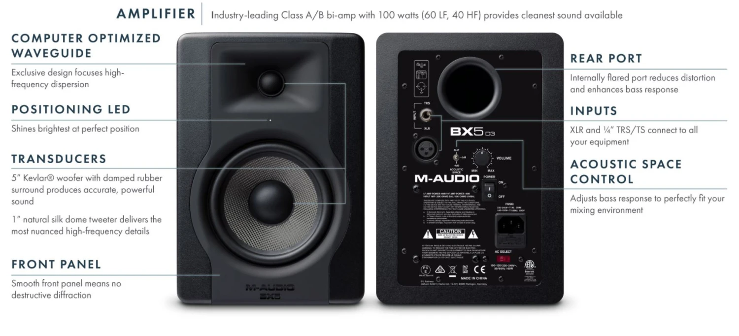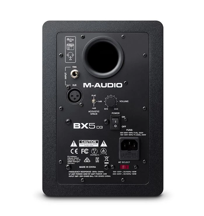 At M-Audio, they understand no two listening spaces are the same. Therefore, the BX5- D3 monitors custom tailors your sound to your environment, so you will always experience sonically-true, reassuringly-accurate sound reproduction. Negate problematic bass frequencies and limit the impact of nuisance standing waves thanks to BX5-D3’s special Acoustic Space control for precise adjustment of BX5-D3’s sound output in line with your studio space. Whatever your needs, the BX5-D3 Studio monitors guarantee to assimilate into your existing setup with ease. Combining conveniently-located, rear-mounted XLR and 1/4- inch balanced inputs, BX5-D3 connects to virtually all studio equipment including audio interfaces, mixers, DJ gear and more.