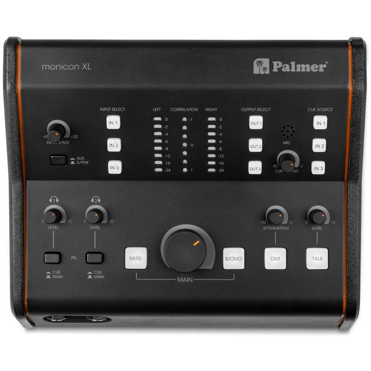 The Palmer studio monitor controller features three analog stereo inputs, one S/PDIF input and outputs for three monitor pairs, each with its own volume controller for level calibration. A further mono summed full-range output is also available for connecting either a mono monitor or a subwoofer. An exclusive highlight of the MONICON XL is its correlation meter, which displays the phase difference between a stereo signal’s left and right channels. This facilitates the quick and simple discovery of mono-compatibility errors in mixes. The controller is also customisable to your personal work style.