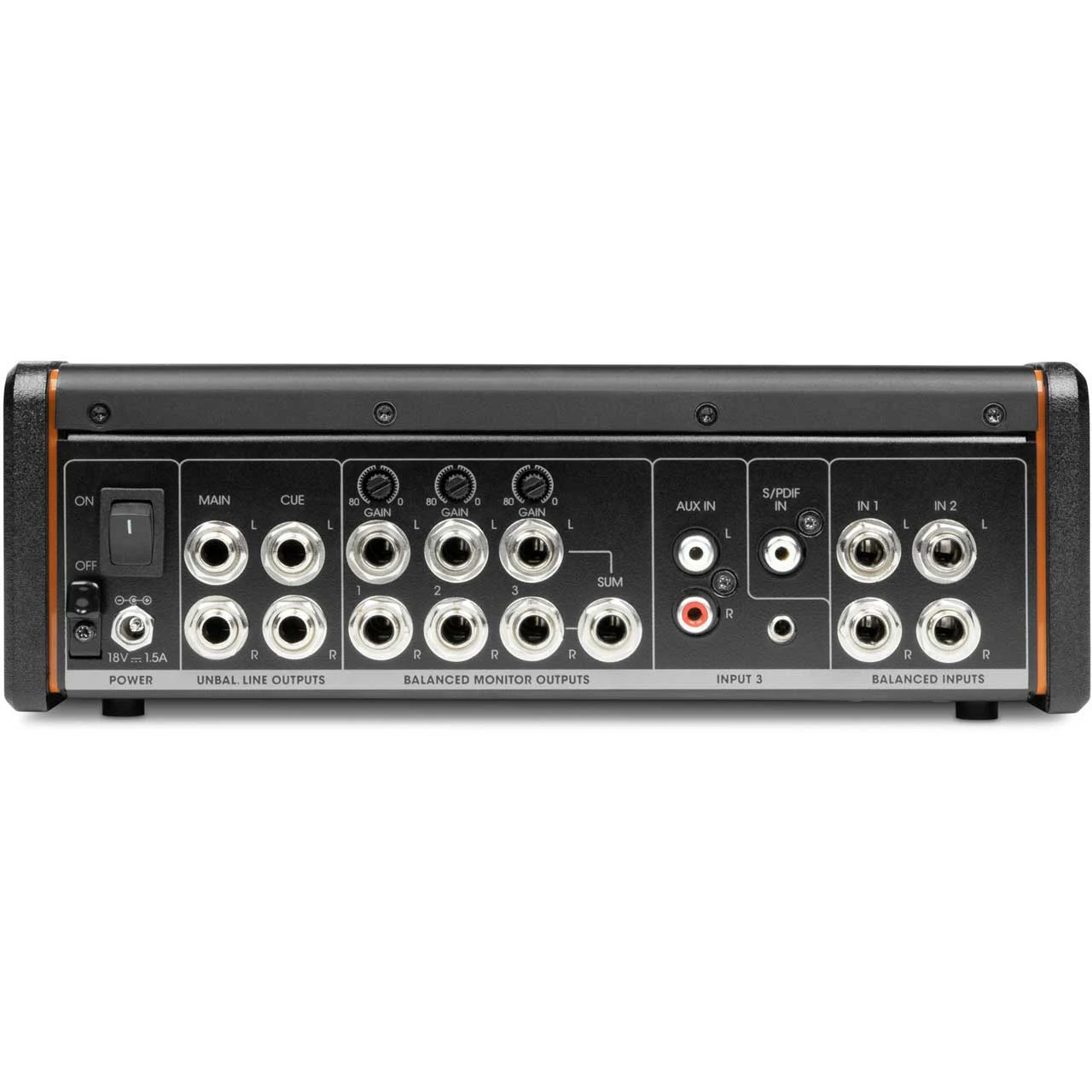 - Output connectors: TRS balanced (1 – 3) , TRS unbalanced (CUE, MAIN, headphones 1 & 2)