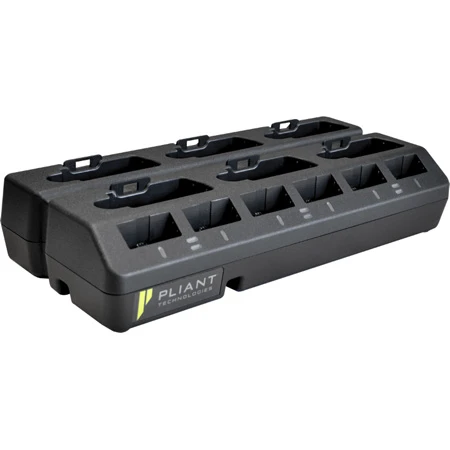 The Pliant PBT-RPC-66 6+6 Drop-in Radio Pack and Battery Charger conveniently charges up to six batteries in the radio pack and up to six stand-alone batteries simultaneously (Batteries not included). An optional 3-position mounting bracket is available for flexible, secure charger positioning (PAC-PBT-MNT).The 6+6 Drop-in Radio Pack and Battery Charger is a customized charging station for CrewCom radio packs and Pliant li-poly [PBT-LIP-01] batteries.