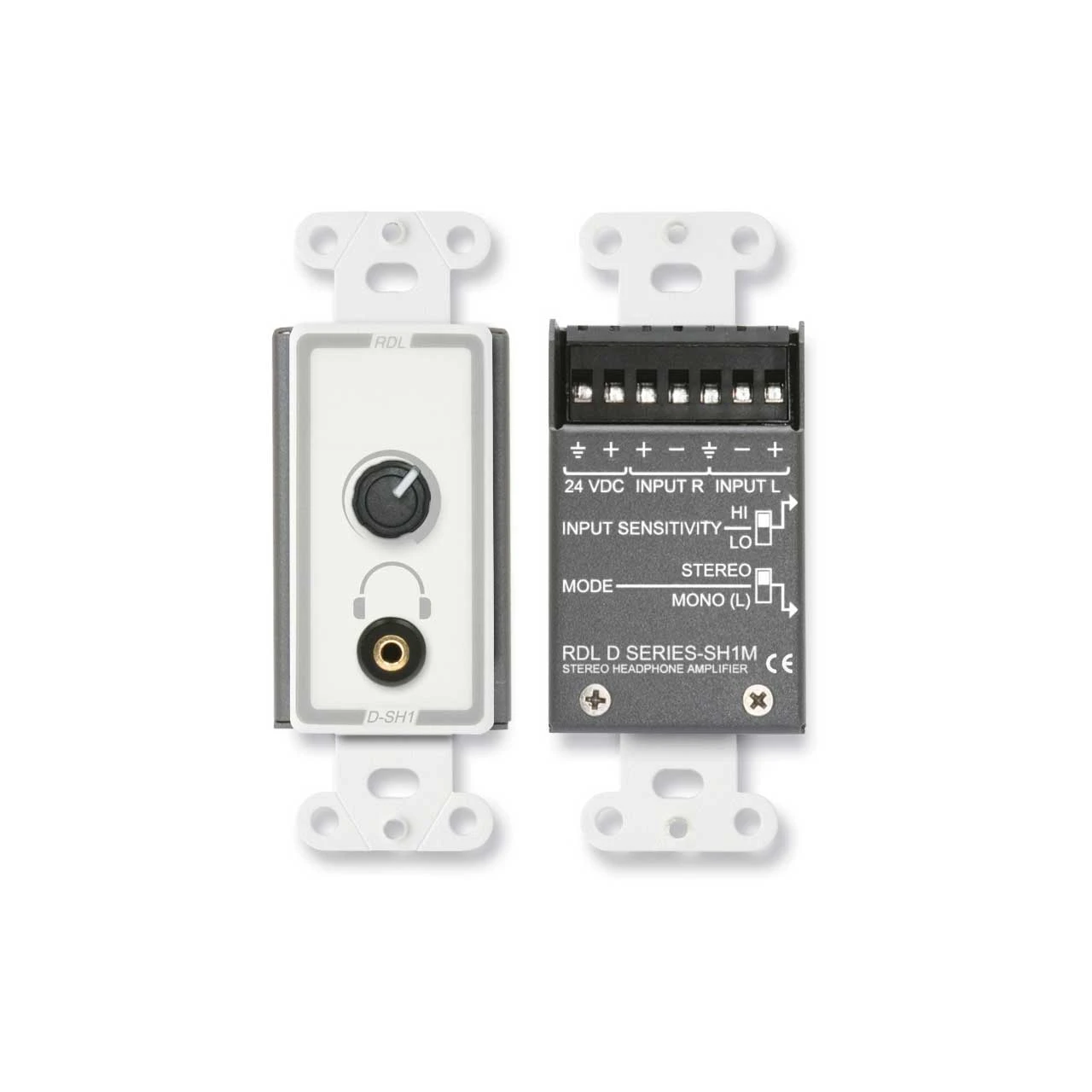 The D/DS-SH1M is used in applications requiring headphones of any impedance to be driven from consumer or professional audio sources. It is ideally suited to applications as diverse as language translation, museums, interview studios and music stores. The -SH1 is a dual channel headphone amplifier with balanced/unbalanced left and right inputs. Each input accepts operating levels between -20 dBV and +20 dBu. Two recessed slide switches located on the side of the rear enclosure are set prior to mounting the module. One switch is provided for setting the input sensitivity. The mode switch selects between stereo and mono operation. In the mono position, the left input is used to drive both output channels. When the module is used in a monaural system, only the left channel input must be wired. The front panel level control is a long life potentiometer controlling matched VCAs. Audio does not pass through this control, assuring years of noise free level adjustment. The output amplifiers deliver more than 50 mW into either high or low impedance headphones. Module operation is from a 24 Vdc ground referenced power supply.