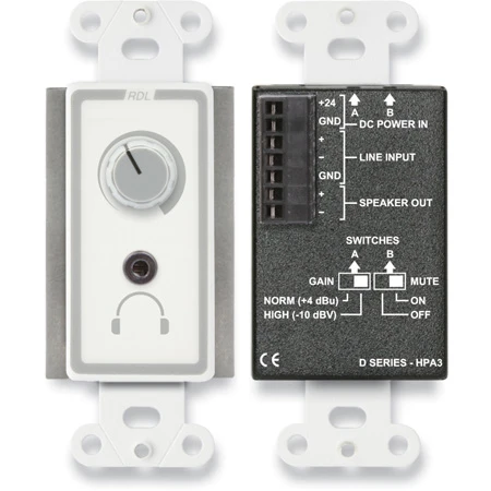 The D SERIES-HPA3 is a high efficiency 3.5 W power amplifier with one line input, an amplified output to drive a 4 or 8 ohm speaker and a separate headphone amplifier. The -HPA3 features a balanced line level input that may be connected unbalanced. The gain range will accommodate standard unbalanced levels as well as professional balanced levels. The amplified output levels are controlled by a front-panel volume control.The amplifier features a Mini-Jack headphone output on the front panel. When a headset is plugged in, the power amplifier may be switched off. Two recessed slide switches located on the top of the rear enclosure are set prior to mounting the module. One switch is provided for setting the input sensitivity. The mute switch determines whether the power amplifier operates when headphones are plugged in.Amplification for the speaker output is provided by a high-efficiency Class D power stage with audio filtering tailored for crisp, pleasant audio clarity. The high-efficiency Class D output stage produces negligible heat for all levels of expected voice or music modulation.The D SERIES-HPA3 is designed to be mounted in a wall box. The front panel does not include any illuminated indicators, making the -HPA3 ideally suited to installation in dark rooms or areas. Wiring is connected through a rear-panel detachable terminal block. Module operation is from a 24 Vdc ground-referenced power supply.