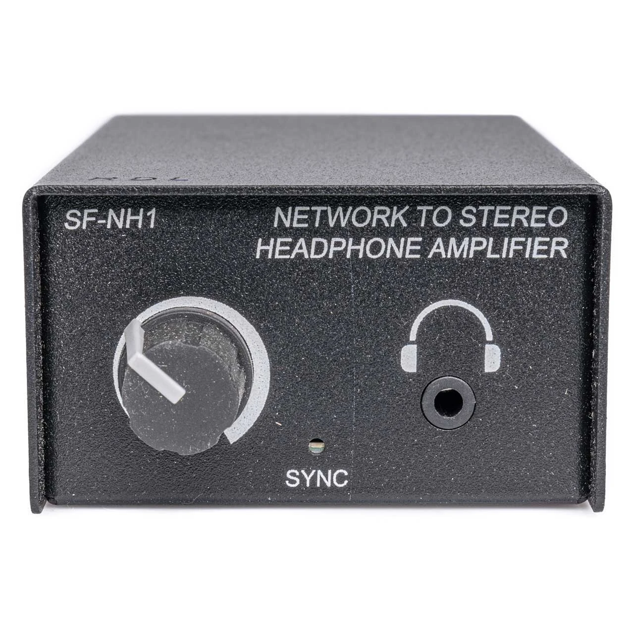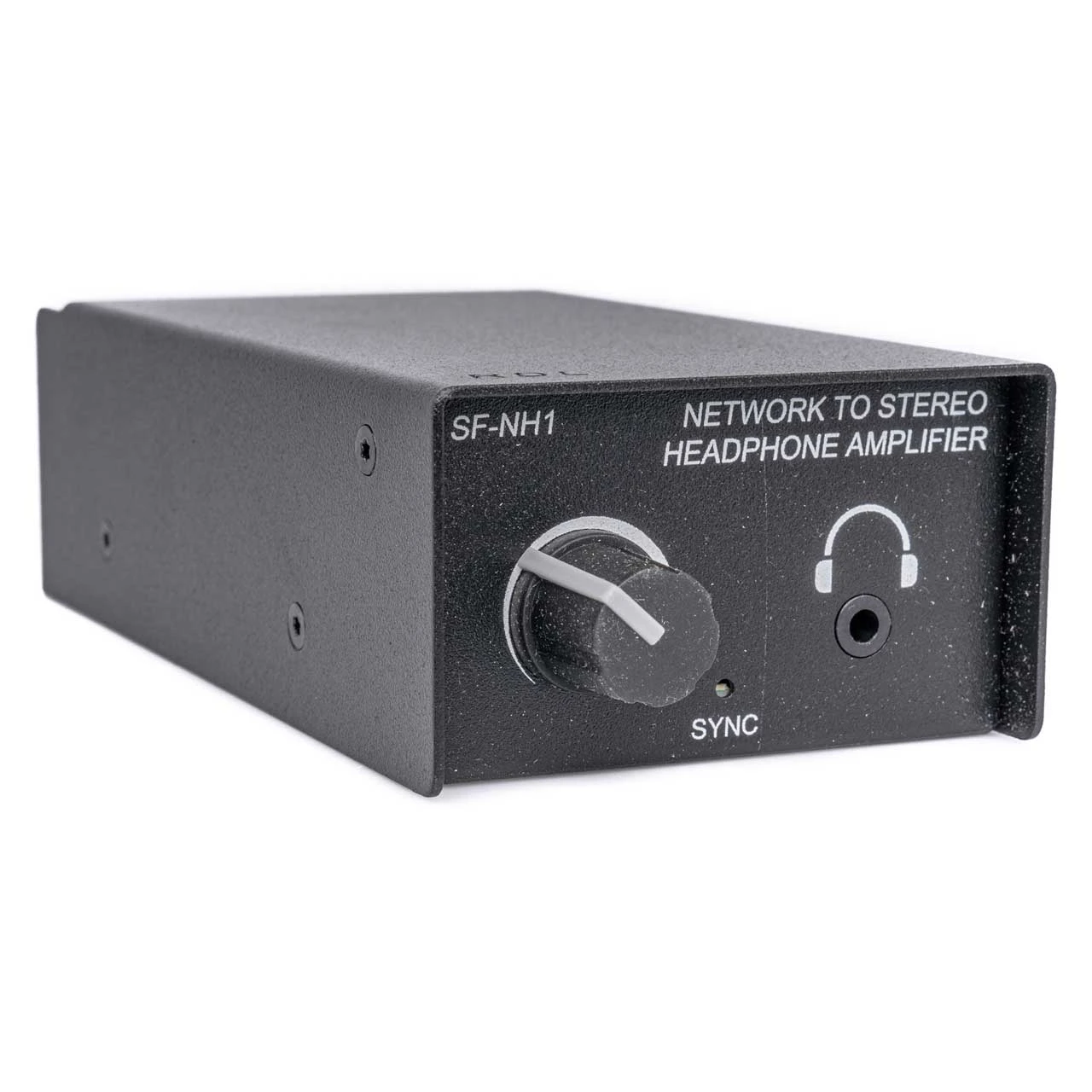 The SF-NH1 is a headphone amplifier that converts two Dante network audio channels to a stereo headphone output with front-panel level adjustment. The output connects through a stereo 3.5 mm Mini-jack. Each channel provides 100 mW into 100 ohms for a network digital audio level of 0 dBFS. Special software is not required to configure the module. The SF-NH1 is a professional grade product for studio quality fidelity and low noise performance.