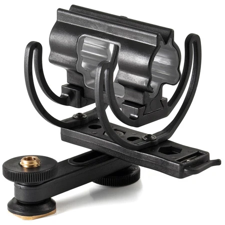 A lightweight, durable clamp holds the microphone in place, and is itself suspended in two of Rycote’s W-shaped patented Lyre mounts, which provide substantially better isolation from camera motor and drive noise and vibrations than traditional on-camera microphone mounts. The Lyres are attached to a mounting bar which may be slotted into the hot shoe mount on top of your camera or screwed into the quarter-inch thread available on some camcorders by means of separately available adapters.