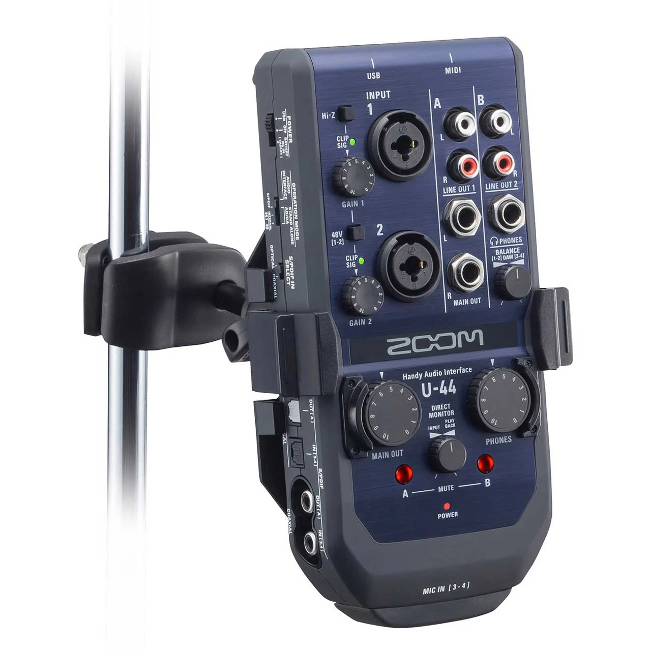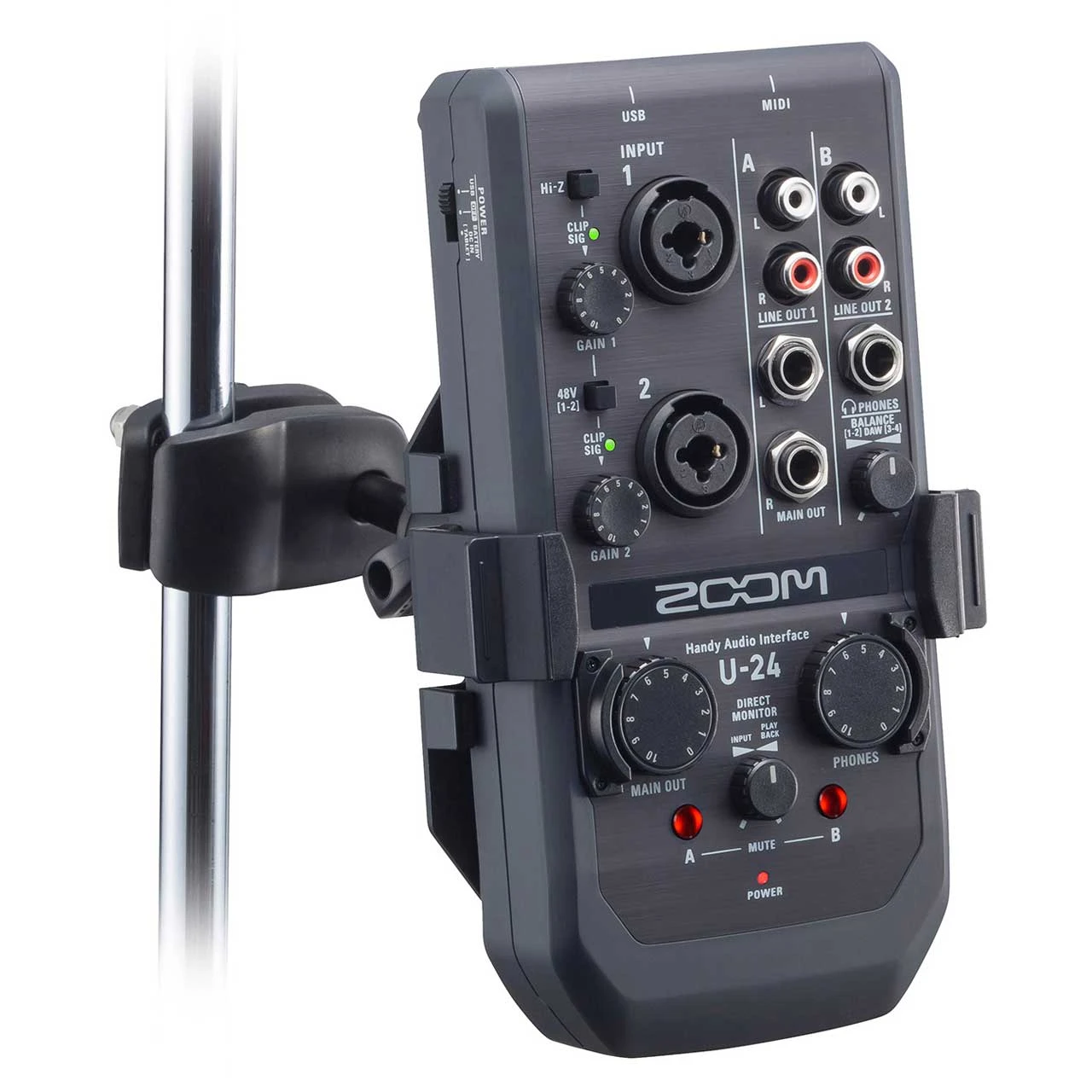 The ZOOM AIH-1 Audio Interface Holder provides a simple and convenient way to mount your U-Series audio interface. With its clamp and binding unit, the AIH-1 lets you attach your U-22, U-24, or U-44 to any standard microphone stand or pole.